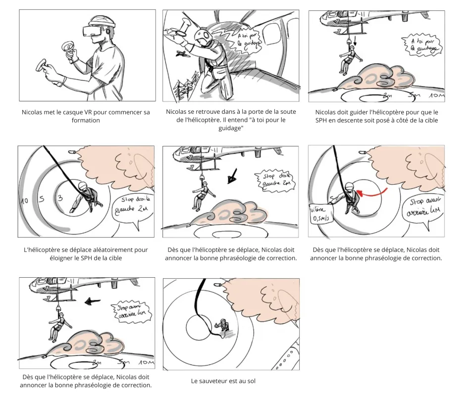Notre client avait besoin d'une expérience de réalité virtuelle pour former ces pilotes et copilote aux procédures de vol d'un hélicoptère. À l'issue du design sprint, j'ai pu storyboarder quelques parties de la formation pour enrichir le compte rendu.